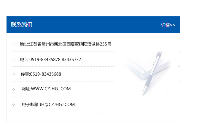 地址:常州市新北區友邦商務大廈1幢16、17層  電話:0519-85101652  傳真:0519-85112595  郵編:213022  網址:www.cz-jiayue_cn.decaibz.com  郵箱:xiajifengaa@163.com